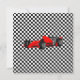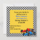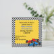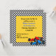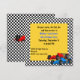 Färgglad pojkfödelsedagsinbjudan, gjord i ett svartvitt rutmönster, med en gul fyrkant för textområdet. Grafik med en blå och en röd formelbil pryder nedre högra hörnet. Texten i blå och svart är helt anpassningsbar och redo att anpassas för din sons stora dag.