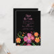 Omfamna elegans med en touch av livfullhet genom vårt "Färgstarka mexikanska blomsterfirande - Spara datum-kort" mot en slående svart bakgrund. Den nedre halvan blommar med handmålade akvarellblommor i nyanser av orange, röd och lila, som utstrålar energi och firande. Den övre delen presenterar dina viktiga detaljer för att spara datum i en förfinad, mjuk rosa text, vilket skapar en fängslande kontrast mot den mörka duken. Denna design utstrålar sofistikering och festlighet och erbjuder ett djärvt och stilrent sätt att tillkännage din kommande speciella tillställning.