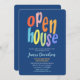En färgglad och rolig inbjudan till öppen hus-fest. Denna fantastiska inbjudan har modern och djärv typografi på en blå bakgrund. Lätt att anpassa med dina egna detaljer för öppen hus eller födelsedagsfirande.