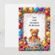 Livlig kantscen för firanden med ballonger, band, konfetti och inslagna presenter längs botten. Mitt i är det vitt utrymme som är ideal för text, inbjudningar eller meddelanden om fester och glada ögonblick.