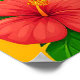 En glad serieelefant som står i en livfull tropisk miljö med färgglada palmer, blommande hibiskusblommor och en solig bakgrund som skapar en livlig och glädjefull atmosfär.