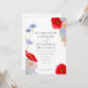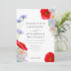 Vacker färgglad vildblomma akvarell boho QR-kod bröllopsinbjudan med elegant grå typsnittsmanus och RSVP QR-kod och detaljer om bröllopswebbplatsen på baksidan av inbjudan. Vår- och sommarblommig konst inkluderar eldröda vallmo med pastellfärger blå och lila kornblommor och persika blå och rosa förgätmigejer och kosmos och grön delikat bladverk. Originalkonst av konstnären Catherine Sweetman