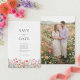 Meddela ditt kommande bröllop med detta färgglada vildblomma spara datum-kort. Det har en snygg kant av rosa, korall och lila akvarell boho blommor på en krispig vit bakgrund. Personalisera med ditt foto på baksidan. Denna design är perfekt för par som planerar en romantisk vår- eller sommarslottsträdgårdsceremoni med botaniskt tema.