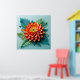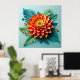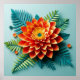 Ljus, intrikat tillverkad blomma gjord av papper, med ljusa orange och gula kronblad och en turkos kärna.