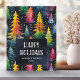 Julbild hälsningskort med ett mönster av färgglada julgranar på en mörkblå bakgrund. Whimsical text "God Jul" och dina anpassade namn och år.