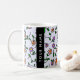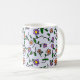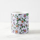 Färgglada blommor, blå bakgrund, svart kaffemugg