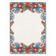 Denna bordskylt med spansk inspiration för bröllop med festskt blomsterarrangemang har en djärv och invecklad blomsterarrangemang med livfulla röda, blå, orange och gröna blommor som skapar en iögonfallande symmetrisk kant längst upp och längst ner på kortet. De blommande klustren ramas in av eleganta svarta ormbunksliknande mönster som ger kontrast och djup åt de färgglada blommorna. Designen kombinerar traditionella delar av folklig konst med modern livfullhet, vilket gör den perfekt för en festlig och firad tillställning som ett bröllop.