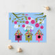 © 2011 Socialite Designs. Whimsical fåglar i färgglada fågelhus med blommande sakura blommor flyttar tillkännagivande.