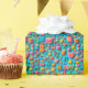 Ljus och glad arrangemang av födelsedagselement inklusive presenter, hjärtan, stjärnor och musiknoter på en livfull blå bakgrund, perfekt för festliga och firande teman.