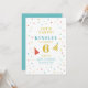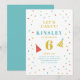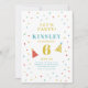 En fantasifull födelsedagsinbijudan för barn med regnbågssprinkles, stort namn och ålder samt födelsedagshattar.