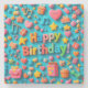 Ljus och glad arrangemang av födelsedagselement inklusive presenter, hjärtan, stjärnor och musiknoter på en livfull blå bakgrund, perfekt för festliga och firande teman.