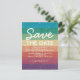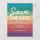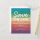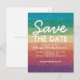 Iögonfallande spara datum vykort med en ljus regnbågsglitterstripe-design och en modern mall för att spara datum. Perfekt för bröllop, familjeåterträffar, födelsedagsfester, klassåterträffar, företagsaktiviteter, julfest, kyrklig verksamhet eller en årsdag.