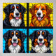 Ljusglänsande glasmålning konst som visar detaljerade porträtt av glada hundar mot färgglada bakgrunder, utstrålar positivitet och värme, perfekt för att fira husdjur och kreativa konstutställningar.