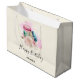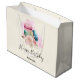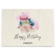 En födelsedagspresentpåse med en förtjusande bild. 3 färgglada makaroner, rosa, gröna och blå med en fin rosbukett och en stänk av rosa vattenfärg. Läcker och stilren också! Ljusgul bakgrund.