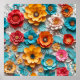 Ljus arrangemang av pappersblommor i olika färger, inklusive röda, gula, orange och blå, mot en ljus bakgrund. Blommorna är intrikat utformade och skiktade, som visar olika former och texturer, tillsammans med blad och mindre blomsterdelar som förstärker blomkompositionen.