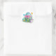 Designstil = 3 påskägg, 1 stort blått, 1 litet ljusblått och 1 lila randigt ägg. med 2 fjärilar, en blå och en gul fjäril.