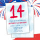 14-årsdag barn pojke blå fest 14-årsdags inbjudan för en 14-årig pojke med roliga teckensnitt och rolig vattenfärg nummer.