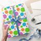 Det här roliga och färgglada inpackningspappret är perfekt för din nästa fest eller firande. Det har ett mönster av ljusa prickar i nyanser av lila, blå, grön, gul och orange. Anpassad text, som ett namn eller annat meddelande, kan enkelt läggas till kostnadsfritt. Många andra produkter med denna design finns också tillgängliga i min butik här på Zazzle, inklusive inbjudningar, presenter och andra festartiklar. Se till att titta in och kolla dem. Glöm inte att följa mig för uppdateringar om nya produkter! Tack för ditt intresse för SapphireDesigns!