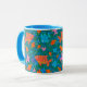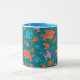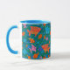 En rolig vit keramisk ringermugg, med en ljusblå kant och handtag och ett mönster av färgglada fiskar som simmar i havet, från en fantasifull handmålad papperscollage av Judy Adamson. Del av den Posh och Painterly 'Fiskar i havet'-samlingen, detta mönster kan anpassas för att passa alla muggar.