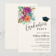 Inbjudan till examensfest med blomsterarrangemang med fina rosa, orange och vita rosor omgivna av gröna blad.
