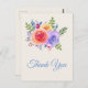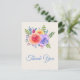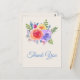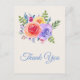 Bröllop tack-kort med en fantasifullt blommig bukett med vattenfärgrosor. Stilig, fantasifull och kreativ. En knippe rosor i rosa, lila och gul. Med massor av små kvistar och blad i grönt, rosa, lila och blått. Bakgrunden är en off-vit champagnefärg. Personligt meddelande på baksidan. Lämplig för andra typer av evenemang också.