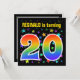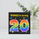 Denna spännande, roliga och livfulla födelsedagsinbjudan har ett färggrant mönster av stjärnformer, tillsammans med siffran "20" med ett flerfärgat regnbågsspektrum eller gradientmönster. Namnet på framsidan kan anpassas. Baksidan visar anpassade detaljer om festen. Födelsedagsinbjudningar som denna kan skickas för att inbjuda gäster till en födelsedagsfest som hålls för att fira någon som fyller tjugo.