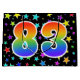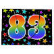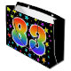 Denna spännande, roliga och livfulla presentpåsdesign har ett färgglatt stjärnfältsmönster, tillsammans med siffran "83" som har ett flerfärgat regnbågsspektrumliknande gradientmönster, på en svart bakgrund. En presentpåse som denna kan vara ett roligt och lyckligt sätt att slå in presenter som ges till någon på deras åttiotredje födelsedag, eller kanske till ett pars åttiotredje bröllopsdag, eller någon annan 83:e begivenhet.