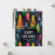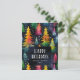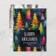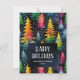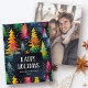 Julbild kort med ett mönster av färgglada julgranar på en mörkblå bakgrund. Whimsical text "God Jul" och dina anpassade namn och år.