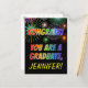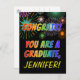 Denna spännande gratulationskort för examen har en design med texten "GRATTIS! DU ÄR EN EXAMINERAD", där bokstäverna har en regnbågsspektrum-inspirerad övergångseffekt, tillsammans med ett personligt namn, och ett färggrant mönster inspirerat av smällande fyrverkerier. Baksidan har ett meddelande som kan redigeras. Ett sådant kort kan vara ett roligt sätt att gratulera en student som nyligen tagit examen från gymnasiet, högskolan, universitetet eller ett annat program.