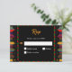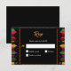 Färdigställ din bröllopsutskick med detta färgrika, livfulla fiesta-floral svarta bröllops-svarskort som är designat för att matcha din festliga firande. Den eleganta svarta bakgrunden framhäver den ljusa, livfulla blomsterkonsten som ger glädjefull färg och botanisk skönhet till era svarskort. Inspirerad av livliga fiestafiranden skapar de livliga blommorna en glad och stilren look samtidigt som de bibehåller en elegant känsla. Detta svarskort låter gästerna svara enkelt samtidigt som det tillför en vacker, koordinerad detalj till er brölloppssvit. Perfekt för par som planerar ett färgglatt fiesta-temat bröllop, livlig kulturell firande eller en festlig kvällshändelse.