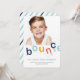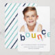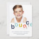 Denna födelsedagsinbjudan till studs-hus-fest med foto har studsande bokstäver i en regnbåge av marinblått, akvatint, gult och orange och en bild på ett barn för att inbjuda vänner och familj att fira.