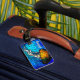 Färggul orange, gulblått havsblått, eget namn bagagebricka
