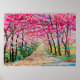 Färglandskapet rosa röd färg Tunneln av Vild himalayan cherry road på morgonen med vintage himlar bakgrund. Hand målade högsäsong för skönhet vår i Thailand.