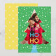 Lägg till en nybörjare till dina julkort den här julhelgen med vårt festkort, roligt, neonkort. Vår helgdag-kortsdesign har en roligt av festlig typografisk design "Ho Ho Ho" och en fet nyare Julgran-design med fallande vit snö. Lägg till fotot i Julgran-formen. Ljusstark Gult, grönt, magenta och teal färg skapar en ljus och fullgod modern juldesign. Den omvända sidan har en roligt gult och vit polka punkt mönster. Bild efter moodthologipapper
