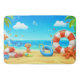 En tydlig illustration av en tropisk strand fylld med animerad havslevande varelser, handflatan träd och starkt himmel. Den lekande scenen fångar glädjen och avslappningen av en sommar-helgdag vid havet.
