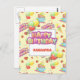 Färgfull födelsedagsdesign med födelsedagstävlingar och jordgubbar, födelsedagskalas, glass och ballonger i lycklig färg. Glatta mönster med ett passerkort för en födelsedag i lycklig. Anpassa om du vill fylla i din egen namn eller lägga till en egen beröring.