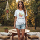 En levande T-shirt, försedd med de livliga nyheterna orange, grönt och rosa, visar en originalplan för återbohemisk fjäril från Mango Måne Studio, parad med den upplyftande sloganen - Frigör din själ.