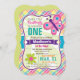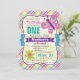 Roligt, Cute Butterfly, vår-blommans temabarn, flickans födelsedagsfest inbjudan på ljusa, giftiga, giriga mönster. Blåblå och rosa fjäril och rosa- och kalkgrön blomma på orange, kalkgrön, teal, korall, vit och akvatisk turkos som plaid rand mönster. En och en födelsedag kan vara personlig till andra födelsedagar för småbarn, barn eller spädbarn, baby.