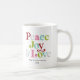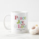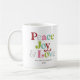 Den här färgstarka freden, glädjen och kärlek-retro-helgdag-kaffet mugg är perfekt för en helgdag. Den enkla designen har söt och roligt typografi med omväxlande färgad brev i rött, rosa, äppelgrönt, turkos och grått.