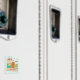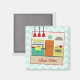En köksmagnet med en illustration av ett återinspirerat kök med turkos, gult, rött och orange färg. Bakgrunden är ljusblå med zig zags. Anpassa den röda texten med ditt namn.