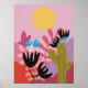 Färgfull sol överger modern cactus rosa blommigt deco liggande konstskrift. Söt trendigets estetiska väggutskrift poster med kaktus, backe, berg, blommor, sand, starkt och fetstilt färg för dekoration av väggar i hemmet, dekoration i vardagsrum, rum. Det starka landskapet. Gift-idé för mor, vänner, kvinnor, dekoratörer, konsthandlare, konstnärer, älskare för nya hem, födelsedagar, jultomtar, helgdagar, alla tillfälle. Originalillustration av Mwanga-design.