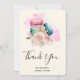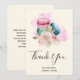 Tack för att du fick ett kort med en fin bild. 3 färglösa makaroner, rosa, grönt och blått med en blommigt i finare ro och en stänk av rosa vattenfärg bakom sig. Äkta och snyggt också!