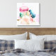 Kanvastryck med en fin bild. 3 färglösa makaroner, rosa, grönt och blått med en blommigt i finare ro och en stänk av rosa vattenfärg. Äkta och snyggt också! Ljust gult.