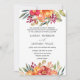 Eleganten och den geologiska utformningen har en krans av vackra målade akrylblommor i orange och gult för rosa, med krukor av färgstark lila och löv för grönt och löv. Kortets omvända i ett helt anpassade mörk grått. Denna inbjudan är perfekt för ett elegant bröllop eller en sommar eller vår firande