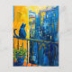 Målning av en blå katt sitter på en balkonisk räls, tittar ner i staden i stadsområden.