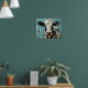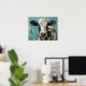 En söt poster för ko älskare med en svart och vit Holstein-ko framför en trädbelagd vägg som är målad blått.