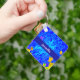 Den här designen har en mörk blått bakgrund med ljusblå snurrar och gult delarare på nyckelkedjor