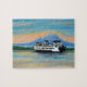 Akrylmålning av en färja framför berget Rainier vid soluppgången. Inspinerad av mitt eget foto från Bainbridge Island.