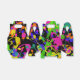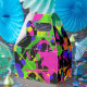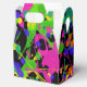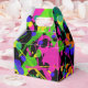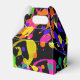 Fet färg stänker i shock rosa, gult, orange, limgrönt, teal och blåviolett dans mot svart bakgrund.