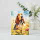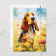 Färgrik akvarellkonst av en Basset Hound som sitter i ett fält med vårblommor.